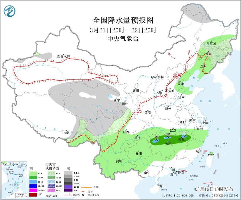 3月19日20时至20日20时,黑龙江东部、吉林东北部、新疆南疆西部山区、西藏西部和北部、青海南部、川西高原北部等地部分地区有小到中雪或雨夹雪,其中,西藏西部等地部分地区有大到暴雪,局地大暴雪(20~28毫米)。西南地区东部、江汉东部、江南、华南北部和西部等地部分地区有小到中雨,其中,贵州东部、湖南中部、江西中部等地部分地区有大雨(25~45毫米)。内蒙古中西部、辽东半岛、山东半岛、西藏西部等地部分地区有4~6级风,西藏南部和东部部分地区有6~8级风;台湾海峡、台湾以东洋面将有5~6级风、阵风7级(见图1)。