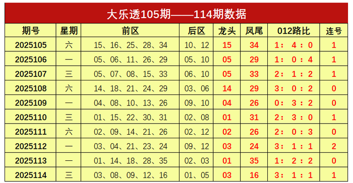 大乐透第2025114期出奖号统计:前区03、08、09、12、16,后区01、05。龙头03,凤尾16,012路比为3:1:1,开出1组连号。